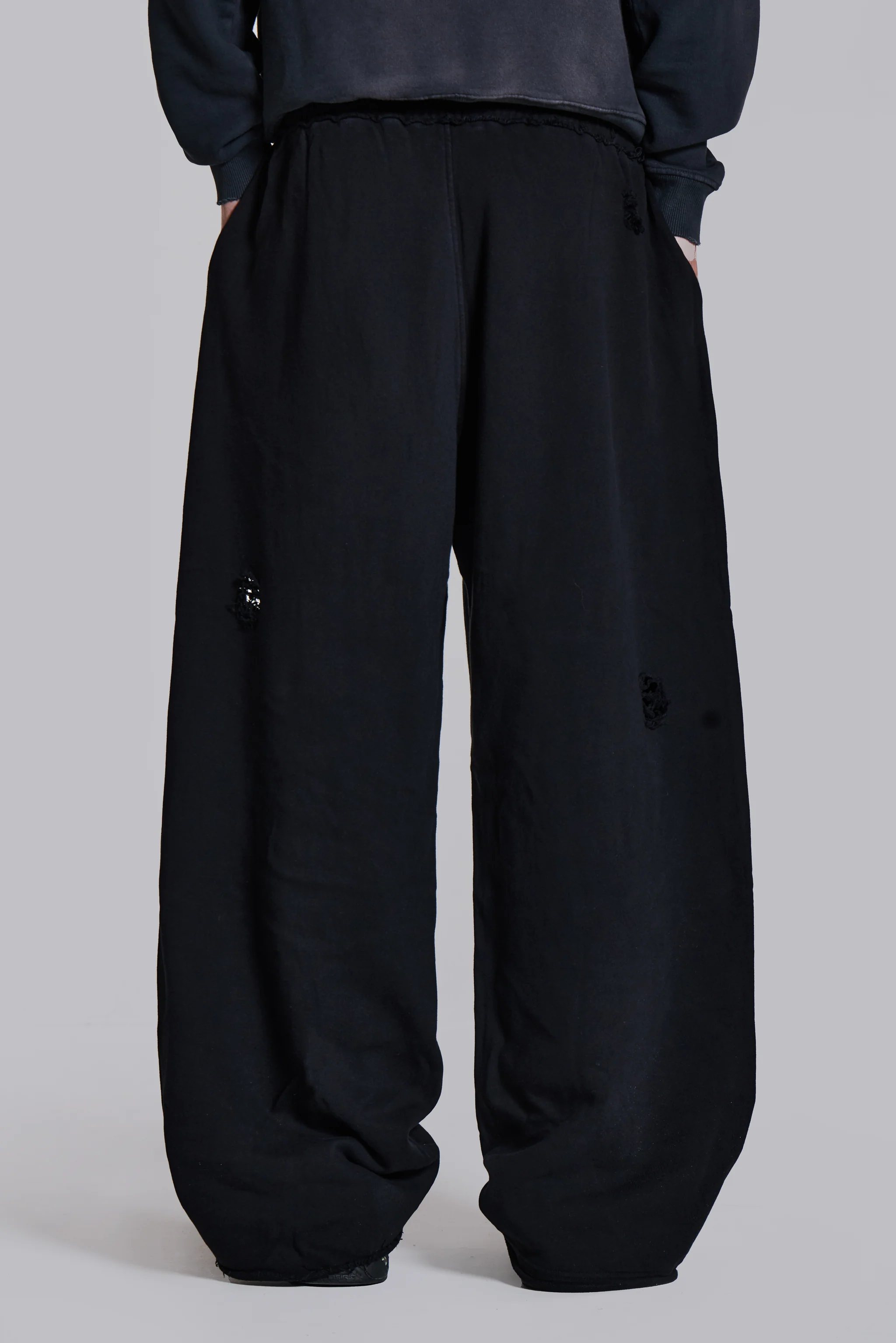 The Distressed Black Monster Joggers In Loopback are crafted from a loopback heavy weight sweat fabric, with extreme distressed rips, vintage wash and elasticated draw cord waistband and tailored in an oversized Colossus fit.