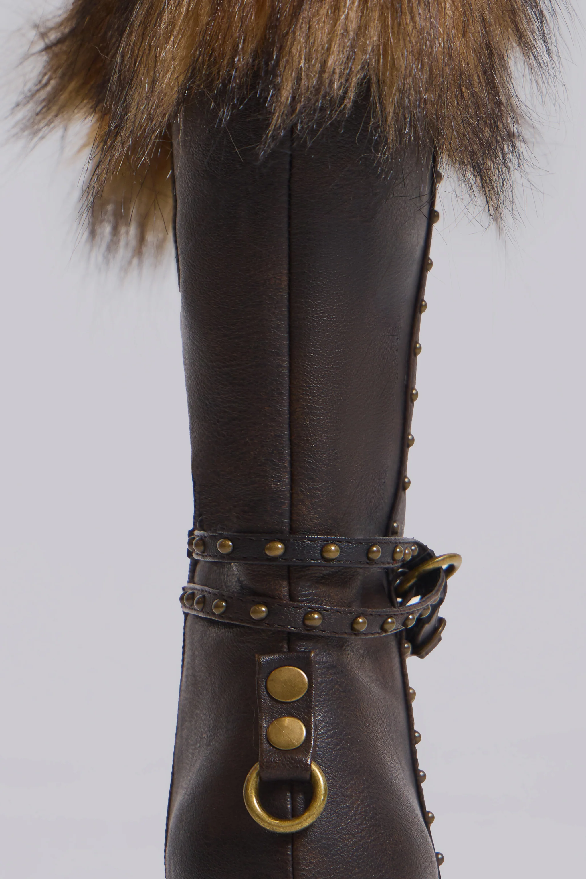 Fauna Faux Fur Heeled Boot. Dark brown calf-high pointed heeled boot in faux vintage washed leather with multicoloured faux fur and studded strap details.