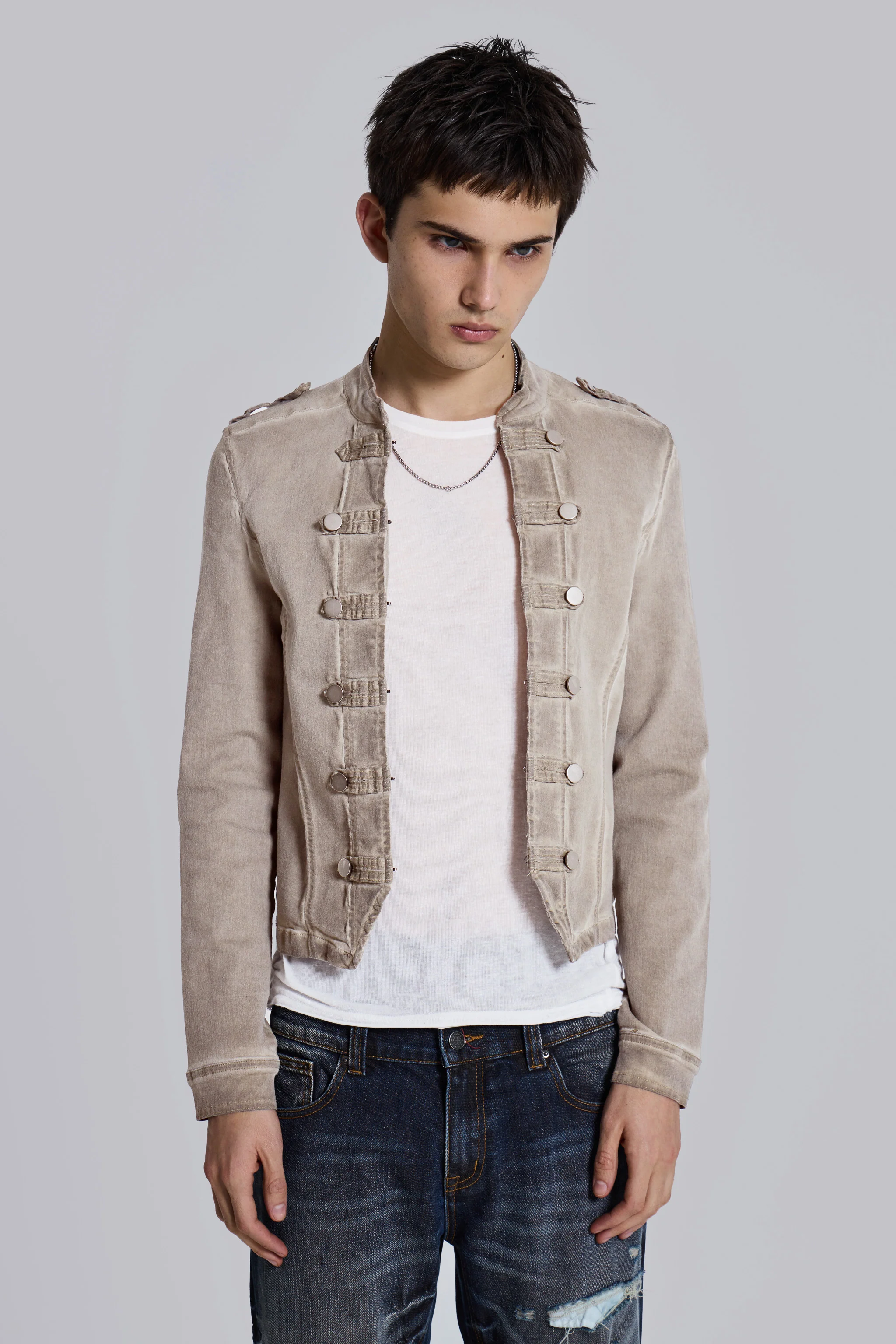 Elevate your wardrobe with the Rebel Jacket – This drummer style jacket has been designed in a shrunken fit and boasts an eye-catching placement dye for a dirty washed white colourway, complete with highlighted seams and antique silver hardware.
