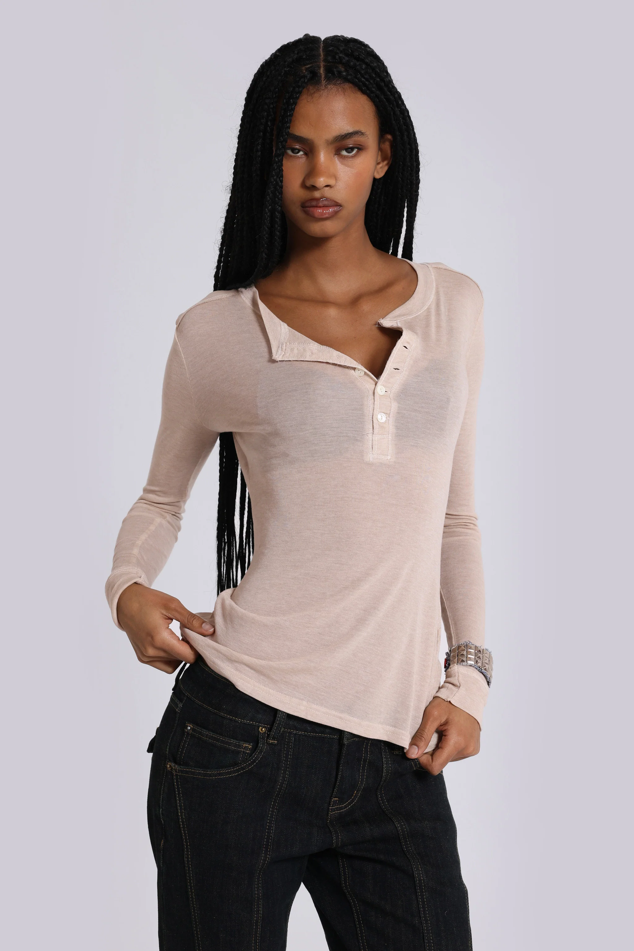 A layering essential, the Haze Henley Top is cut to a full length, tight fit in sheer jersey. The lightweight construction creates a subtle, barely-there effect. Finished in an oatmeal colourway for versatile styling.