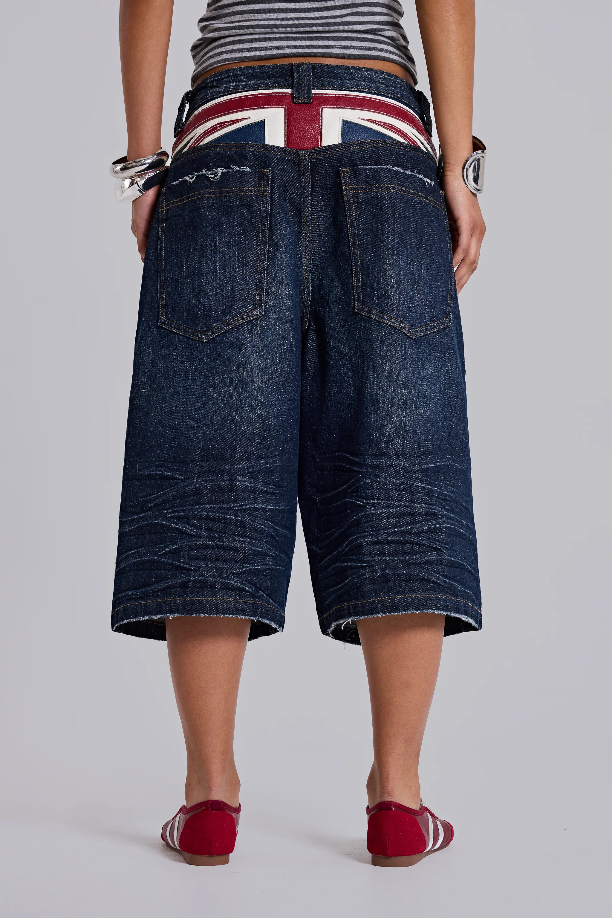 These jorts are cut in the signature Colossus jort fit, delivering a bold, oversized silhouette. Crafted in a rich indigo colourway with golden tobacco stitching, they blend classic denim detailing with statement design. A faux leather applique Union Jack adds a standout heritage-inspired finish.